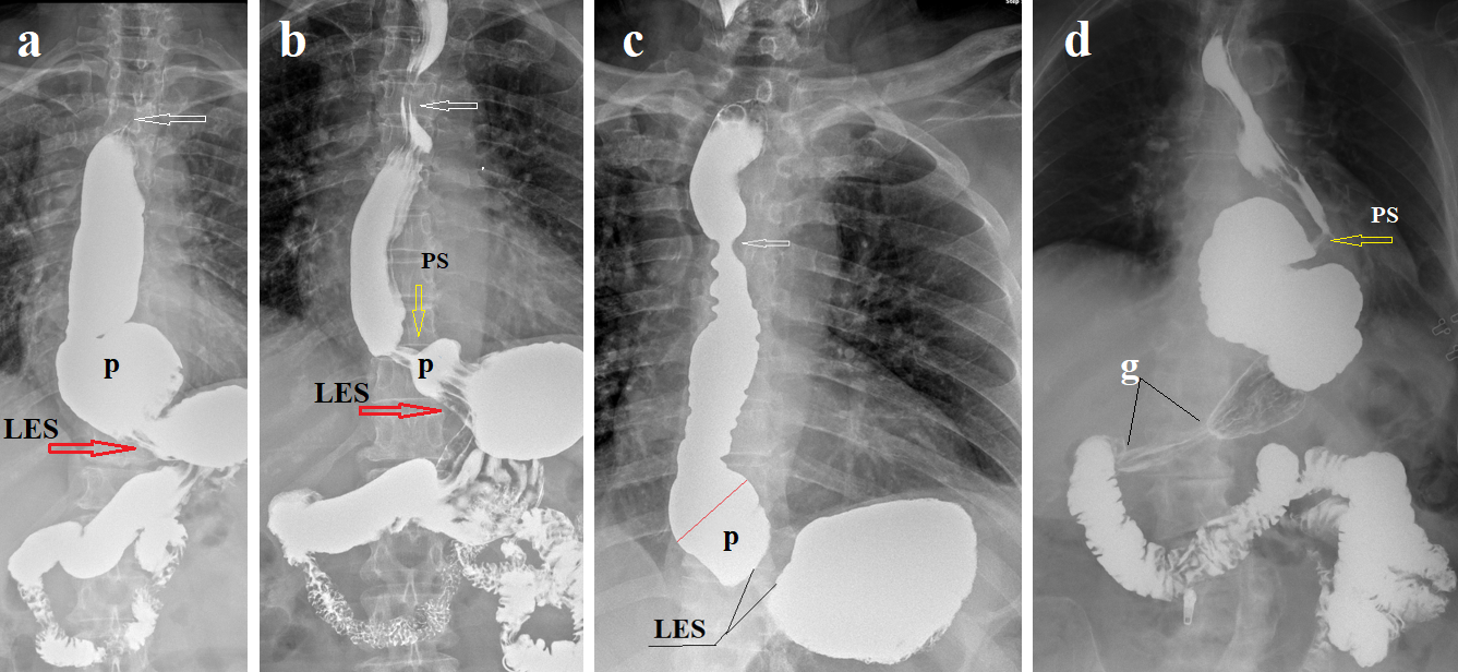 Figure 1. Esophageal radiographs are taken at high gastric pressure. Red arrows indicate the LES, yellow arrows indicate the proximal sphincter, which proximally closes the phrenic ampulla (p); white arrows indicate the aortic sphincter, which occurs because of acid retention in esophageal constriction at the level of the aortic arch. (a). At high pressure, the contracted LES does not close the EGJ. (b). The same patient. After 5 minutes of resting, free reflux is determined. The LES is shortened, and the hiatal orifice is dilated. Due to chalasia of EGJ, the patient feels heartburn as soon as acid appears in the stomach. (c). A patient with severe esophagitis with only extraesophageal symptoms. The length of the LES is more than 2 times shorter than the minimal normal limit. He wakes up at night because he chokes on saliva. This is due to the contraction of the aortic sphincter. After he swallowed a dense tablet with a diameter of 1.9 cm, almost all symptoms disappeared. The absence of pain syndrome indicates damage to the sensitive elements in the wall of the esophagus. (d). S-shaped esophagus in an elderly woman after Nissen fundoplication. The esophageal dilation has developed over the overly compressed LES. The red arrow shows the narrowing, which is mistakenly called the LES, displaced into the chest cavity. This is the proximal sphincter, the contraction of which closes the lumen of the phrenic ampulla proximally to create a high pressure in it, exceeding the pressure in the stomach. The long rigid antral gastritis (g) shows that hypersecretion of hydrochloric acid is not only a problem of the esophagus.