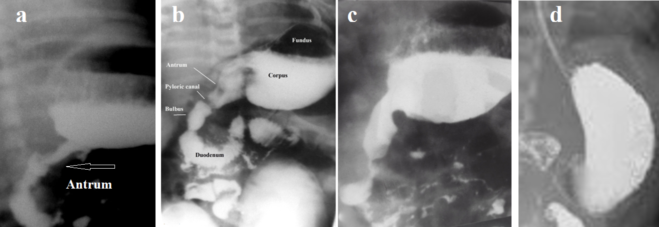 Figure 2. Barium X-ray of the stomach in patients with GERD. (b,c,d,e). Stages of gastric distension in infants.