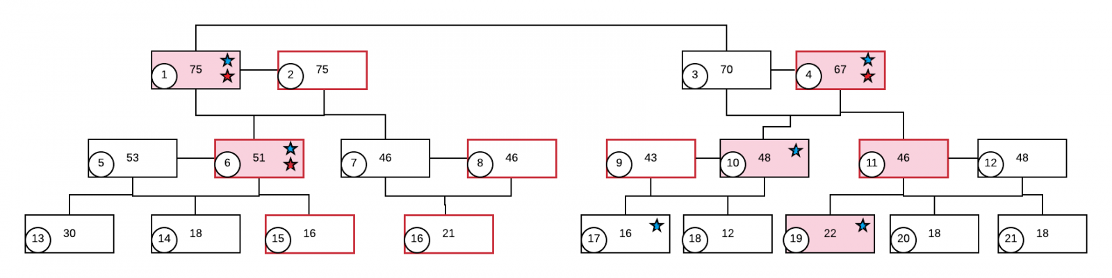 Figure 3. Three generations of a family, each member of which has his own number in the circle. Women - in a red frame. In the center of the square shows the age. A pink color indicates family members with a clear clinical picture of GERD. The blue asterisk is milk intolerance. The red star is a restless baby.