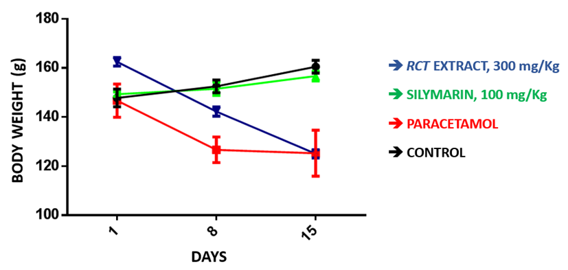 During the experimental period, the weight loss of the rats of group n°4 treated with the RCT extracts is significant (p<0.05) compared to the control group and the group treated with silymarin.