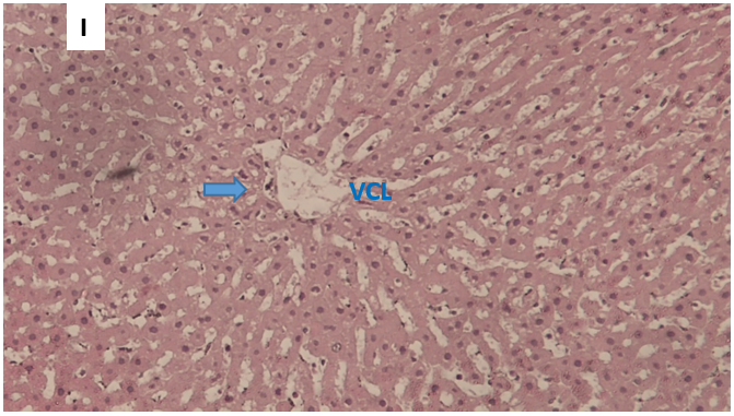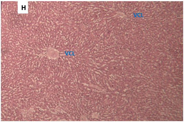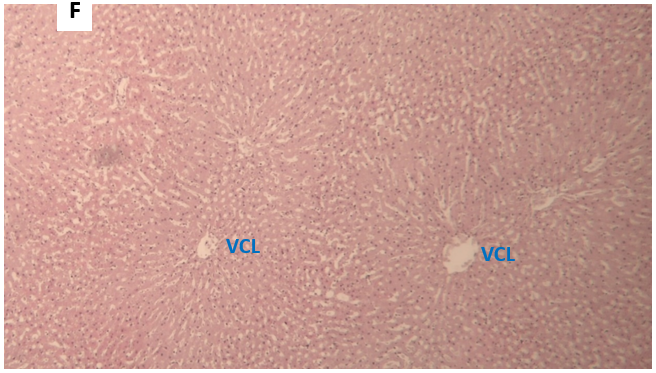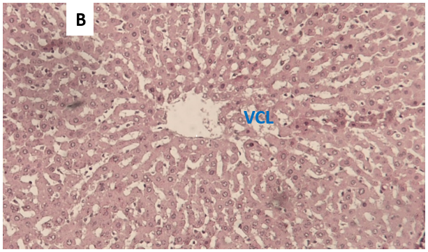 The liver of rats in the control group presents a normal lobular architecture marked by the presence of hepatocyte trabeculae arranged radially around a centrilobular vein. These trabeculae are separated by sinusoids (Figures 3-4).