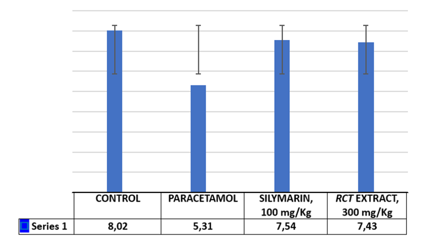 The results of the liver marker assays (ALAT, ASAT, total bilirubin) were in the same direction, since the reductions in the levels of the latter were better with the batch treated with the RCT extracts than with the batch treated with PCM alone.