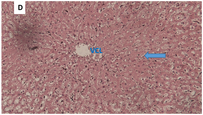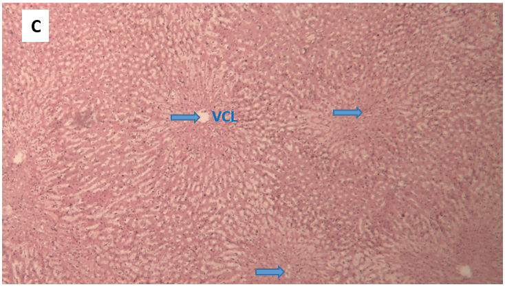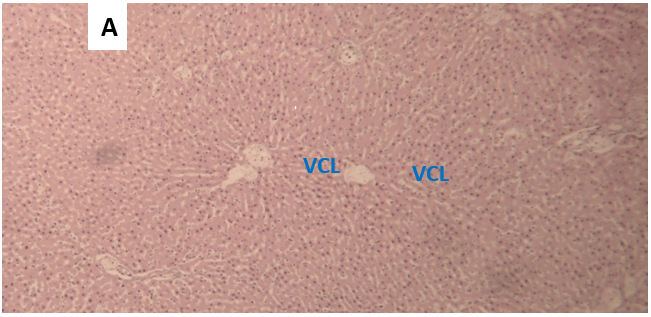 After the experimental period, the animals were sacrificed, the liver removed immediately, sliced and washed in 9% saline solution, weighed and then preserved in 10% buffered formalin. After 3 weeks of fixation in formalin, the organs underwent a succession of steps: Fixation, impregnation, inclusion, fine sectioning with a microtome. The ribbons thus obtained were spread on glass slides and stained with hematoxylin-eosin. The slides obtained were read and interpreted under an optical microscope (Leica DMLS trinocular microscope with 5 MP camera system). So we took the images of the histological sections obtained to compare them first with each other, then with the data in the literature.