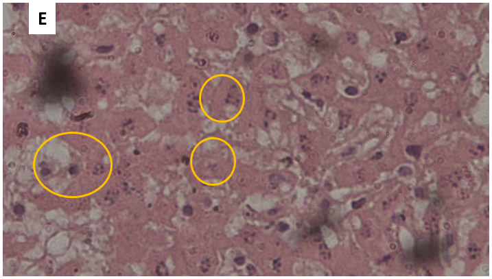 Observation microphotograph E: the nuclei of the hepatocytes are at different stages of the necrosis process.