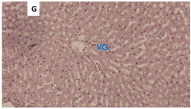 Observation of microphotographs F and G: Persistence of some signs of cellular damage limited to the first rows of hepatocytes closest to the centrilobular vein. The hepatic architectural structure is clearly recognizable.