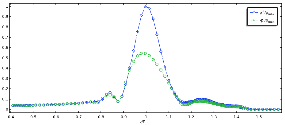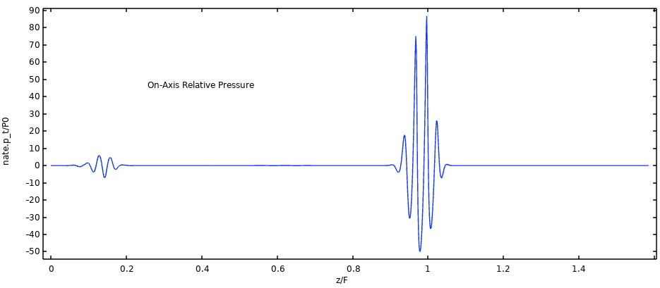 On-Axis Pressure Distribution: The normalized minimum (p₋) and maximum (p₊) on-axis acoustic pressure over the simulated time interval confirms the p₊/p₋ ≈ 2 ratio at the focal point, further validating nonlinear propagation. The spatial extent of the focal zone is also clearly delineated, showing rapid pressure decay away from the focus.