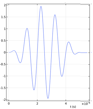 Figure 2 represents the input waveform used in the simulations. The source signal consists of a five-cycle sinusoidal tone burst that serves as the excitation signal. This finite-duration pulse is characteristic of therapeutic ultrasound applications where controlled energy delivery is required rather than continuous wave excitation. The five-cycle duration ensures the pulse occupies a limited spatial extent, enabling tracking of wave evolution. The source amplitude (P₀ = 0.1 MPa) was carefully chosen to generate detectable nonlinear effects without producing shock discontinuities.