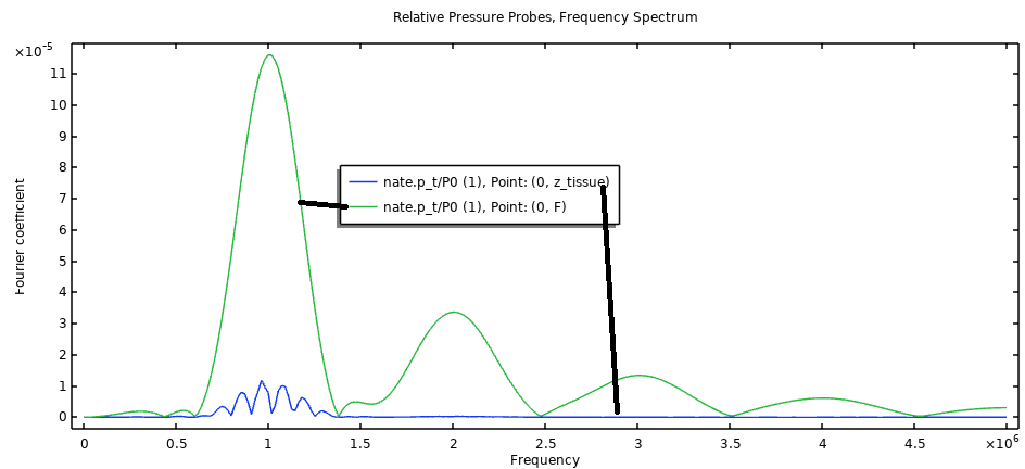 Figure 7. Frequency spectrum of the acoustic pressure at the water/tissue interface and at the focal point.