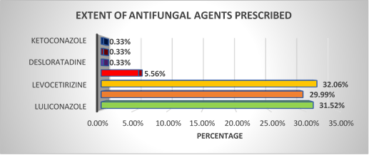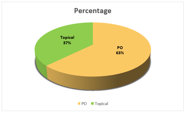 - (62.55%) AntiFungal agents were prescribed by Oral route as compared to Topical route (37.44%).