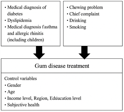 Lastly, multiple regression analysis was conducted to determine the effects of dyslipidemia, diabetes, and allergic rhinitis (including children/adolescents) on periodontal treatment outcomes. Statistical significance was set at p < 0.05 (KNHANES³, see Figure 1).