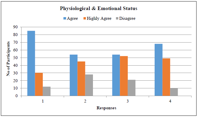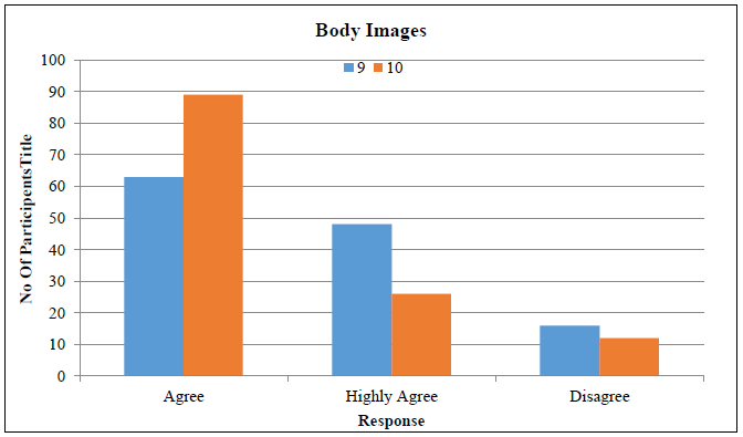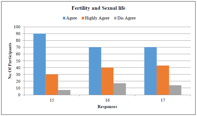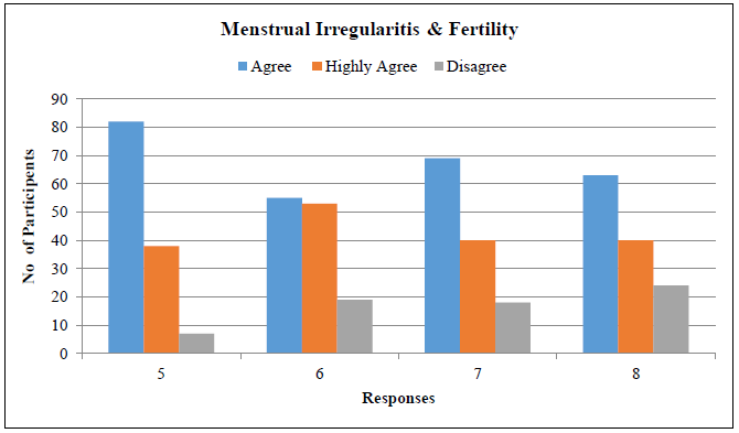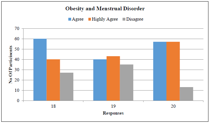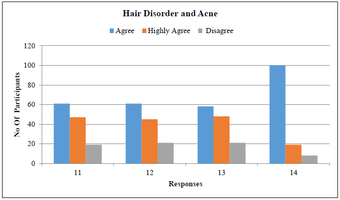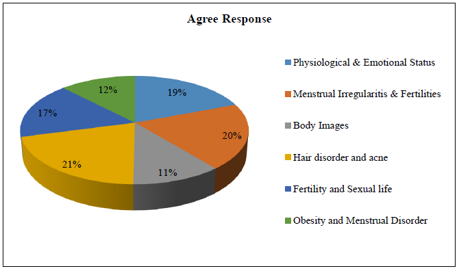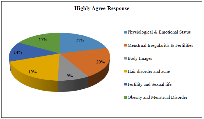 In overall 6 factors the more agree responses were found in hair and acne disorder (21%) whereas, less number of responses were found in body images (11%). Similarly, the highly agree responses were found in Physiological and emotional status (21%) whereas, less number of responses were found in body images (9%) and the more disagree responses were found in obesity and menstrual disorder and (23%) whereas, less number of responses were found in body images (8%) [10-29].