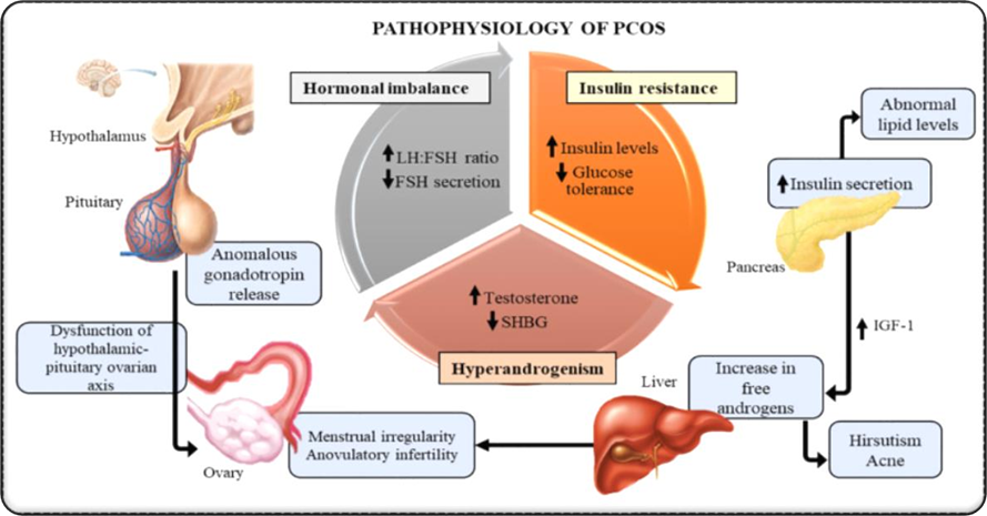 In PCOS reproductive hormones will be imbalance as a result. Consequently, irregular menstrual cycles, Irregular menstruation, and uncertain ovulation are common in PCOS patients. Due to anovulation, or absence of ovulation, small follicular cysts—fluid-filled sacs containing immature eggs may be seen in the ovaries on ultrasonography. One of the most frequent reasons for infertility in women and those who were Assigned Female at Birth (AFAB) is PCOS. Additionally, it may make you more susceptible to other illnesses [1].