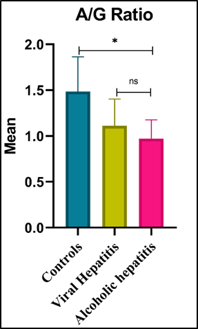 Figure 3. Comparative Distribution of A/G ratio in Control, Alcoholic Hepatitis, and Viral Hepatitis Groups.