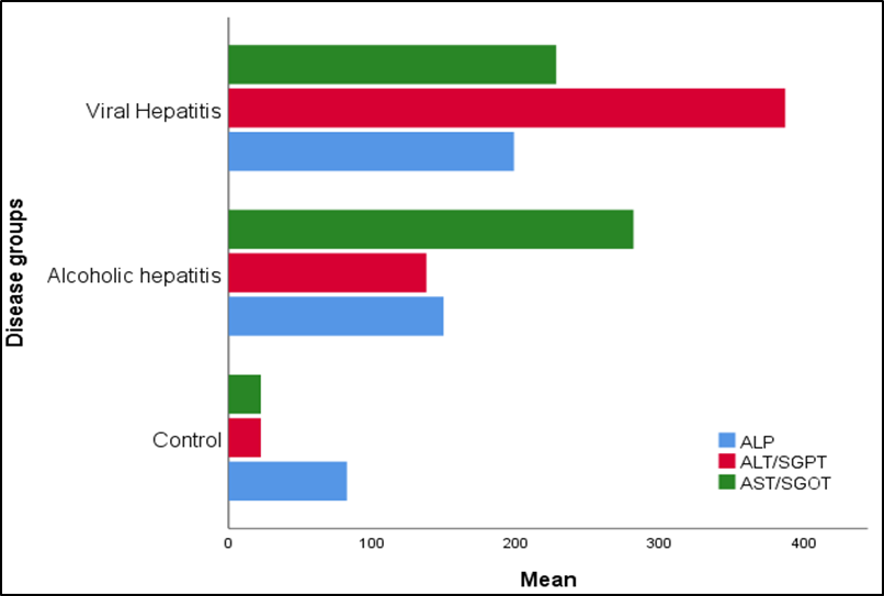 Figure 1. Comparative Distribution of serum enzyme markers in Control, Viral Hepatitis, and Alcoholic Hepatitis Groups.