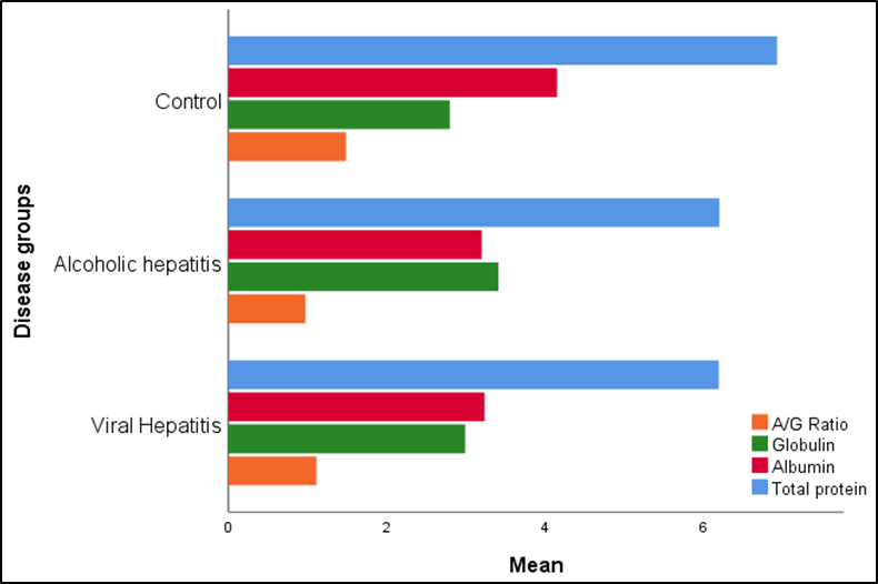 Severe hypoalbuminemia was observed in 86-88% of individuals in both disease groups and may be indicative of hepatic dysfunction. Similar albumin levels in both viral and alcoholic hepatitis might be related to severity of acute disorders and protein synthesis irrespective of etiology. Studies shown reduction of albumin/globulin (A/G) ratio from controls to viral hepatitis and alcoholic hepatitis may potentially be associated with varying inflammatory activity and altered immunoglobulin profiles [23]. Albumin has prognostic value that goes beyond diagnosis, affecting clinical therapy and outcome prediction in individuals with hepatic dysfunction. In the current study both diseased groups individuals showed severe hypoalbuminemia (< 3.0 g/dL), indicating significant hepatic impairment and emphasizing the necessity of careful monitoring and intensive supportive care. Hypoalbuminemia has been found in several studies to be a reliable prognostic marker in a variety of clinical settings. Its significance as a universal predictive biomarker in hospitalized individuals with hepatic and other systemic illnesses was highlighted by Oster et al., who showed that low blood albumin levels are independently associated with higher morbidity and death, irrespective of cause of the disease [24].