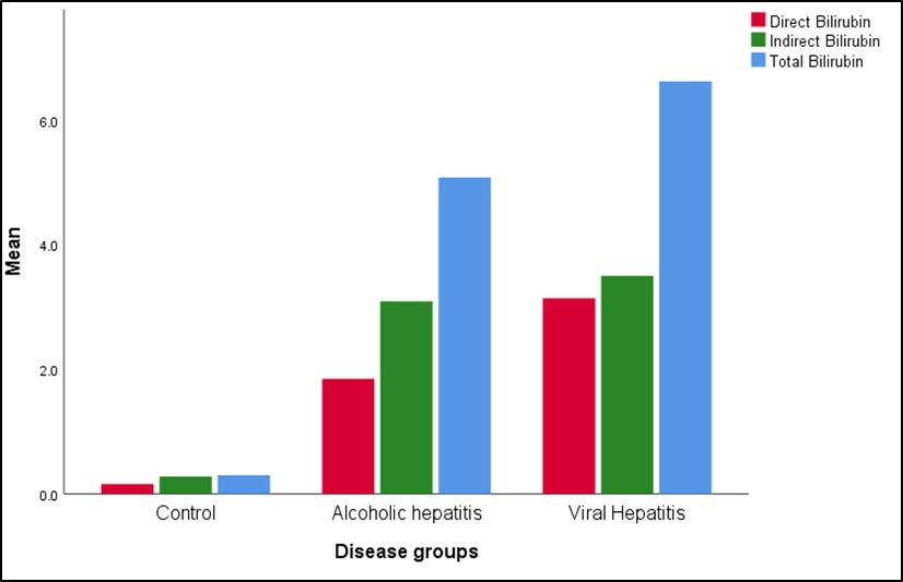 Figure 5. Comparative Distribution of Serum Bilirubin Fractions (Total, Direct, and Indirect) in Control, Alcoholic Hepatitis, and Viral Hepatitis Groups.