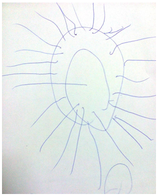 Figure-1E. After cure of autism, at the clinic, she accepted to take a pen to draw something she likes.