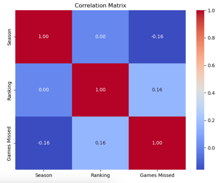 This study was performed as part of a thesis project for a Master of Science degree in Data Science. Although no human subjects were used and the information was publicly available, this project was still reviewed and approved by Western Governors University for Academic purposes (Institutional Review Board). The premise of this study was obtaining time lost and regular season rankings from the NBA 2021-2022 and 2022-2023 using spotrac.com. A machine learning model (multinomial regression) was then applied to see if a prediction could be made for regular season rankings in the 2023-2024 from the previous two seasons using the Python Scikit-learn library.