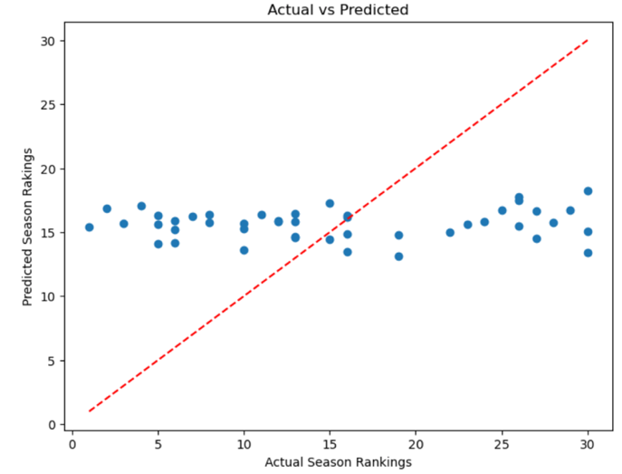 The multinomial regression had a predictive power of 0.16 (Figure 1) (MSE 76.9, R^2 0.004) from games missed to ranking in both regular season and post season. Even when season was accounted for, the predictive power did not change as shown by Figure 2.
