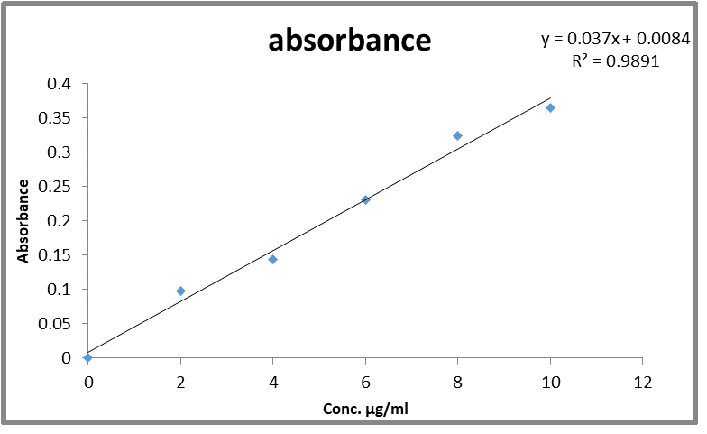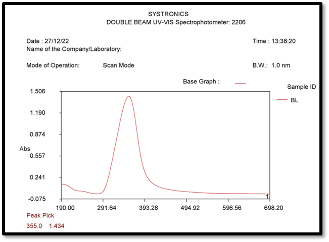 For this,1 ml of (Betel leaf oil) was placed in a 10 ml volumetric flask and dissolved in 8 ml of ethanol, then the volume was built up to the mark using ethanol. To make a stock solution of 100 µl/ml of Betel leaf oil. This was used as final (standard) stock solution 100µl/ml. The solution was scanned in the range of 200 to 400 nm and the corresponding λmax value was reported using solvent system blank.