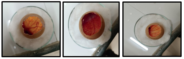 The hen’s egg chorionic test (HET-CAM) is an alternative to animal testing for the identification of serious skin irritants, using embryonic chorion (Figure 3A, 3B & 3C). The skin irritation of the developed formulation has been verified by the chicken egg chorion test, a rapid, sensitive, and inexpensive test for incubated eggs, which is a case of the boundary between In-vivo systems and In-vitro systems, and does not conflict with ethical or legal standards or obligations (Table 7).