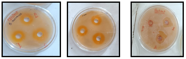 Preparation of inoculum Staphylococcus Aureus, Pseudomonas Aeruginosa, and Streptococcus Pyogenes were used to estimate the antibacterial efficacy of the topical formulations containing betel leaf oil and the inoculation of agar plate (Figure 2). Wells were prepared by using a sterile cork borer by making holes in the inoculated agar plates (Table 6). Each well was 5 mm in diameter. A weighed amount of the formulation was placed into each well. The plates were incubated at 37°C for 72 hours and observed for inhibition zones. The area of the inhibition zones was measured by using a ruler to the nearest millimeter.