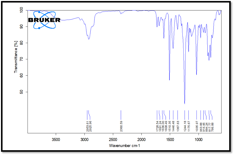 For this, potassium bromide dispersion method was used. The drug was previously dried in desiccators and the blend of betel leaf oil and potassium bromide (1:3) was prepared. The baseline correction was made using dried potassium bromide and spectrum was recorded over 4000-400cm-1. The spectrum has been used for elucidation of structure of betel leaf oil by interpreting the major peaks observed in the spectrum.