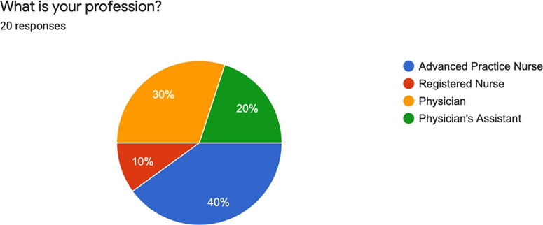 20 healthcare providers participated in the educational intervention. The majority of respondents were Nurse Practitioners (40%) followed by Physicians (30%), Physician Assistants (20%), and 1 Registered Nurse (10%) (See Figure 1). 95% of the respondents identified as white, not Hispanic or Latino, while 5% identified as black, Hispanic or Latino (See Figures 2 and 3).