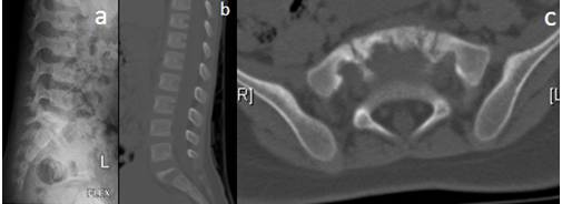 Lumbosacral x-ray showed a destructive lesion of the sacrum with loss of vertebral height and sclerosis, figure (3 a), skeletal survey didn’t demonstrate any other lesion in the skeleton.