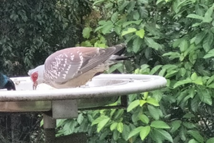 1. Distinctive red eya patches 2. White wing spots 3. Noisy calls 4. Similar to rock-dove 5. Gregarious 6. Internationally least concern |