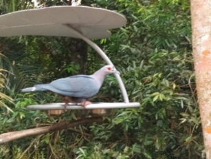 1. Important seed disperser 2. Bare red skin around the eyes 3. White or pale grey band across the centre of the tail 4. Black ‘V’ marked on the back 5. Internationally least concern |