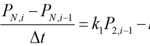 In the above equation, the derivative dPN/dt is replaced by the difference quotient, PN,i - PN,i-1and k1P2 - k2 PN by k1 P2, i-1, - k2 PN, i-1 , such that PN ,i , the concentration of PN at at the current time step i, can be easily calculated from the previous time step. Equations 1, 2, 3, and 4 are solved in a similar manner: