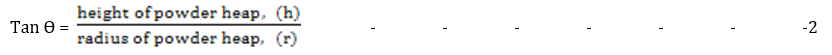Angle of repose is defined as the maximum angle possible between the surface of a pile of the powder and the horizontal plane. It involves the use of a plastic funnel in ring-supported by a retort stand. A sheet of paper was placed below the funnel assembly. A sheet of fibre board was placed below the funnel orifice making sure it fits tightly. A given quantity of the microsphere (30 g) was transferred into the funnel. The fibre sheet was drawn away and the timer simultaneously started. The timer was stopped when all of the powder had passed through the funnel. The height of the heap was measured using a graduated ruler. A pencil was used to outline the base of the contour. The angle of the conical heap so formed was determined from equation 5. The powder was returned to the funnel and the experiment was repeated thrice [10].
