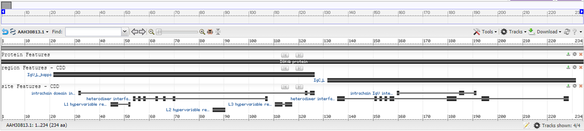 Figure 1. IGK@ protein [Homo sapiens] graphic (in dark) by NCBI (https://www.ncbi.nlm.nih.gov/protein/AAH30813.1?report=graph) shares IG domains with Ophiocomina nigra IGKappa protein(in grey) issued from ophuirid IGKappa gene