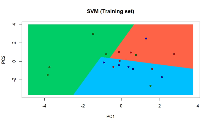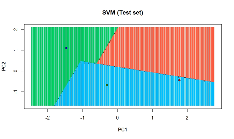 Explanation of the results: Out of training set and test set, the SVM (support vector machine) visualized with same-colored dots of pigeons which were common in such markets.