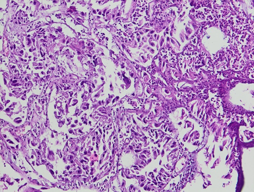 Histological examination reveals an adenocarcinomatous proliferation arranged in glands with villous structures (70%) and solid foci (30%). Tumor cells exhibit a cubic or columnar morphology. The cytoplasm appears eosinophilic, occasionally clarified. Nuclei display hyperchromatism and marked anisokaryosis, particularly in clear cells, along with numerous mitoses. Within solid foci, cells are polygonal, featuring rounded nuclei and large nucleoli, with abundant mitotic activity. Vascular emboli and nerve infiltration were identified. Immunohistochemistry demonstrated expression of PAX8, Vimentin, and Progesterone Receptors, while PSA, chromogranine, GATA3, WT1, and P63 were negative.