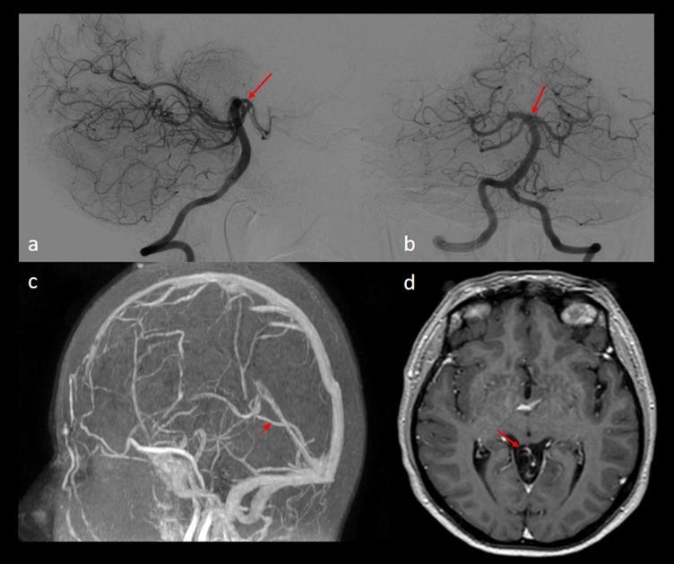A 40-year-old female patient known for microprolactinoma, in a good health otherwise, was referred to our department after a cerebral MRI showed a mural vein of Galen malformation (Figure 1-a and 1-b).