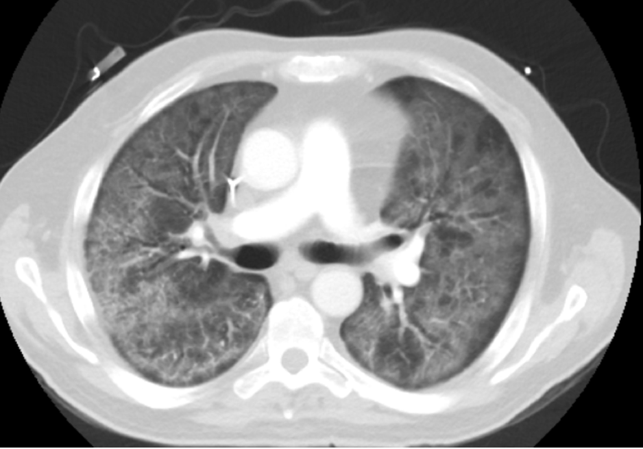 Figure 2. CT chest displaying bilateral infiltrates in the interstitial tissues consistent with known PCP infection.