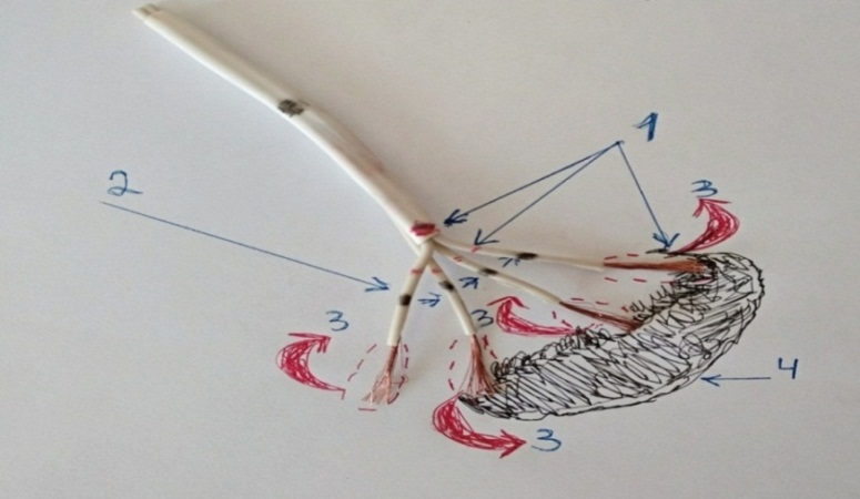 Figure 5. Damage to the necrotic zone of T cells that create an “antioxidant barrier” for the Purkinje fibers. Development of fibrillation. Note: the figure shows an approximate model of the electrical conduction pathway of the heart. 1. Connective tissue sheath and T cells. 2. Distal foci of ectopia (4 black dots). 3. Rotational waves of micro re-entry (red circular arrows). 4. Zone of myocardial necrosis (black dash).