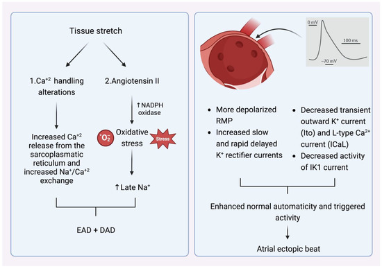 Figure 9. (Left) Mechanism that explains how tissue stretch promotes atrial premature beats, mainly through afterdepolarization. (Right) Specific electrophysiologic properties of the pulmonary veins render them more likely to be the origin of atrial ectopic beats. NADPH oxidase (nicotinamide adenine dinucleotide phosphate oxidase) EAD: early afterdepolarization. DAD: delayed afterdepolarization. RMP: resting membrane potential.